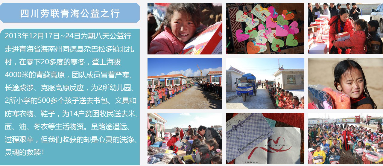 2013年12月17日~24日為期八天公益行走進(jìn)青海省海南州同德縣尕巴松多鎮(zhèn)北扎村,在零下20多度的寒冬,登上海拔4000米的青藏高原,團(tuán)隊成員冒著嚴(yán)寒、長途跋涉、克服高原反應(yīng),為2所幼兒園、2所小學(xué)的500多個孩子送去書包、文具和防寒衣物、鞋子,為14戶貧困牧民送去米、面、油、冬衣等生活物資。雖路途遙遠(yuǎn)、過程艱辛,但我們收獲的卻是心靈的洗滌、靈魂的救贖!